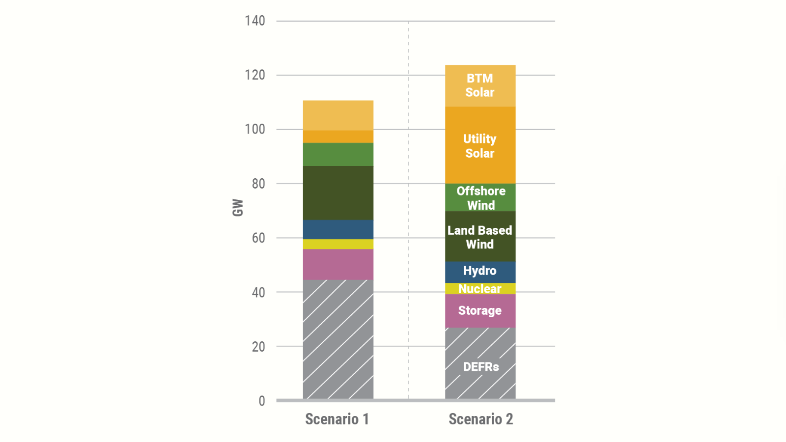 - In Scenario 2, which assumes lower peak demand but greater overall energy consumption, 124 GW of such resources would be required.