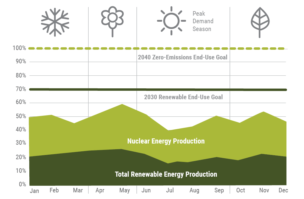 In 2019, renewable energy production from in-state resources represented 22% of overall statewide electricity load. All NY-based zero-emissions resources, which include wind, hydro, and nuclear power, amounted to 50% of statewide load. While the chart does not include the contributions of behind-the-meter solar production, or possible clean energy imports from neighboring regions, it is clear that substantial increases in large-scale clean energy generation from in-state resources will be needed to meet CLCPA mandates. Further, these resources will need capabilities to balance the short-term and seasonal variability in renewable energy production.