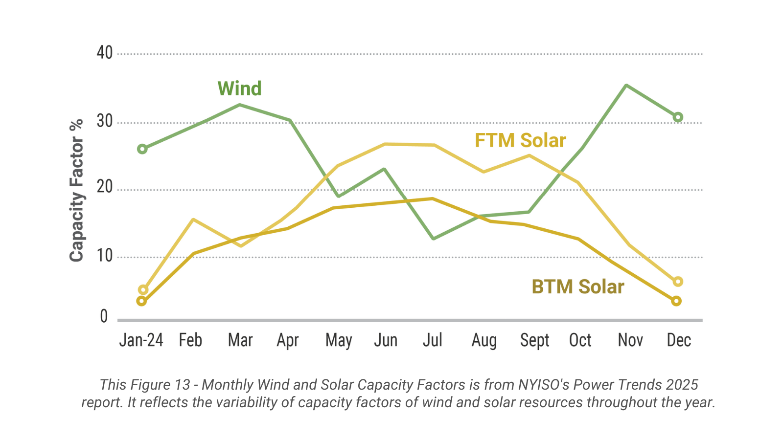 The report highlights how wind resources tend to operate at higher capacity factors during the winter months, while solar resources achieve higher capacity factors in the summer. The inability to precisely predict energy output from these resources requires other, dispatchable resources to be available to grid operators.